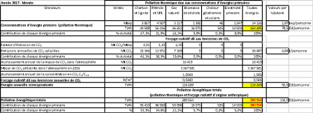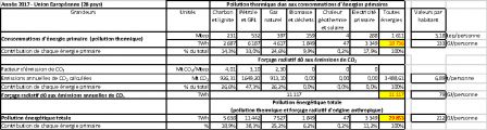 La pollution énergétique totale, cumul de la pollution thermique et du forçage radiatif d’origine anthropique, était donc en 2017 de l’ordre de 134 gigajoules (GJ) par personne à l’échelle de la planète, l’Union Européenne (28 pays) étant 1,58 fois plus émettrice que la moyenne mondiale et la France métropolitaine 1,61 fois plus.