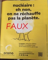 En novembre 2019, la société Orano (ex-Areva en faillite) publiait dans le magazine « Femina » diffusé par plusieurs titres de la presse quotidienne régionale, une publicité dont le message principal était : « nucléaire : eh non, on ne réchauffe pas la planète ». Ce slogan publicitaire était inscrit dans le panache d’une tour de refroidissement de centrale nucléaire. Or c’est l’équipement qui a précisément pour fonction de refroidir le condenseur de la machine à vapeur actionnée par la chaleur de fission atomique … et qui réchauffe la planète. Contre l’évidence Orano/Areva n’avait donc pour seul argument qu’une mauvaise publicité.