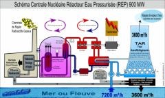 Parmi toutes les techniques courantes de production d’électricité, la centrale nucléaire est celle qui émet le plus de chaleur par kilowattheure produit. C’est la raison pour laquelle les centrales nucléaires nécessitent de grandes quantités d’eau pour être refroidies. Et c’est pourquoi elles sont construites au bord des fleuves, des mers ou des océans. Pour donner un ordre de grandeur, le rendement de conversion en électricité, de la chaleur dégagée par la fission nucléaire à l’intérieur d’un réacteur, est à peine supérieur à 30% (8).