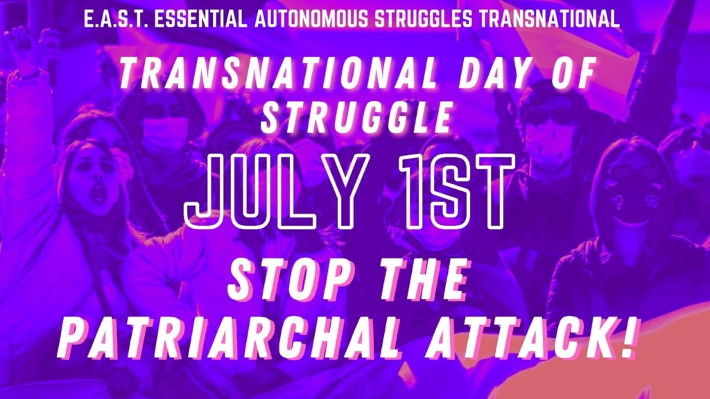 sur 23 maiRd E.A.S.T. organise une réunion de travail en ligne coordonner la journée d’action transnationale du 1er juillet. Nous invitons tous les militants, travailleurs et organisations qui partagent notre compréhension de la nécessité d’actions collectives pour lutter contre la violence patriarcale à se joindre à nous pour cette réunion. Nous y discuterons de la manière de mobiliser ensemble, des pratiques que nous pouvons partager, des slogans communs qui peuvent résonner au niveau transnational.