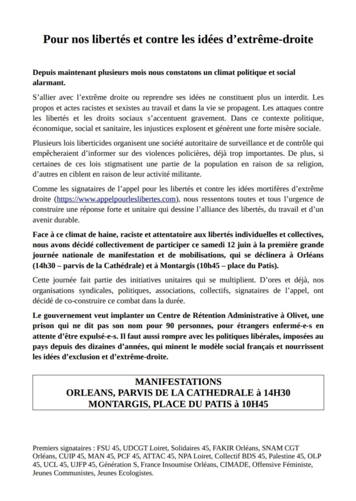 Ce samedi 12 juin, en fin de matinée, une marche « pour dire non à l’extrême droite » était organisée à Montargis, avant une manifestation similaire à Orléans, dans l’après-midi.