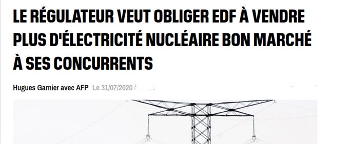 ou comment le pouvoir macronien aux ordres introduit la concurrence dans le domaine de l’énergie car de fait, à la demande de l’Union européenne, EDF a obligation depuis 2011, dans le cadre de la loi Nome, de vendre à ses concurrents un quart de l’électricité produite par les 58 réacteurs nucléaires français. Soit un volume de 100 térawattheures (TWh) au prix fixe de 42 euros le mégawattheure (MWh), moins cher donc sue le coût de revient de sa production !!!!!!!!!!!!!!!!!!!!!!!!!!!!!!!!!!!!!!