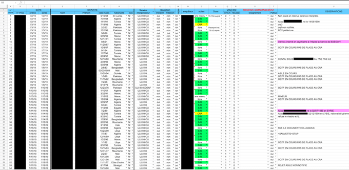 D’autant qu’il ne s’agit pas d’un petit dysfonctionnement. Ces contrôles aux faciès sont à l’origine de plusieurs milliers d’interpellations en Île-de-France. Dans le 93 au moins, ces étrangers interpellés sont inscrits dans un fichier baptisé « registre ILE » à la légalité plus que douteuse, selon plusieurs avocats consultés. À l’intérieur sont renseignés un certain nombre de données d’identité (nom, nationalité…) et d’éléments de procédure (consultation du fichier « visa bio », « suite » donnée au cas…). Un espace est également prévu pour indiquer d’éventuelles « observations ». On y trouve la mention d’alias mais aussi ponctuellement des informations médicales : « individu interné en psychiatrie », « malade asthme important », « enceinte et malade », « conduit à Avicenne [l’hôpital de Bobigny] par les SP [sapeurs-pompiers] de Drancy pour hyperventilation et tétanie ». Un simple fichier Excel accessible sans identifiants qui ne semble pas vraiment correspondre aux normes imposées par la Commission nationale de l’informatique et des libertés (Cnil) (3).