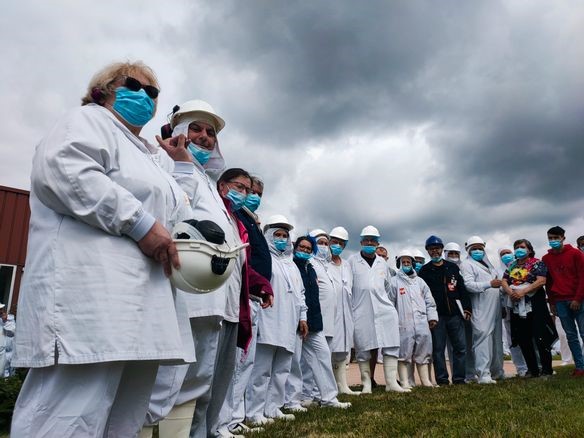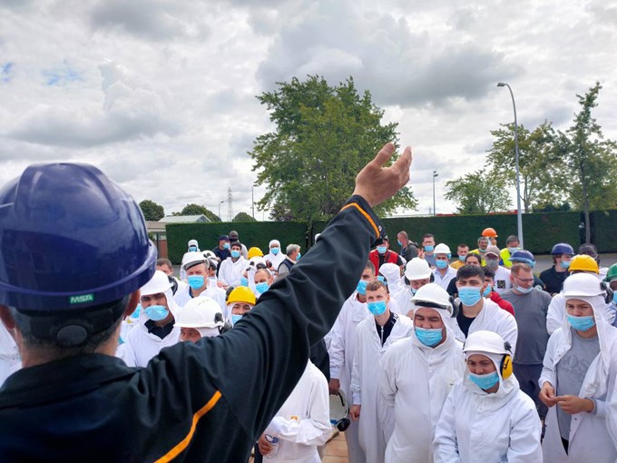 L’action, c’est l’activité totalement bloquée depuis l’aurore. Et environ 200 salariés en cote blanche, bottes, casqués et sous charlottes, devant l’imposant bâtiment.