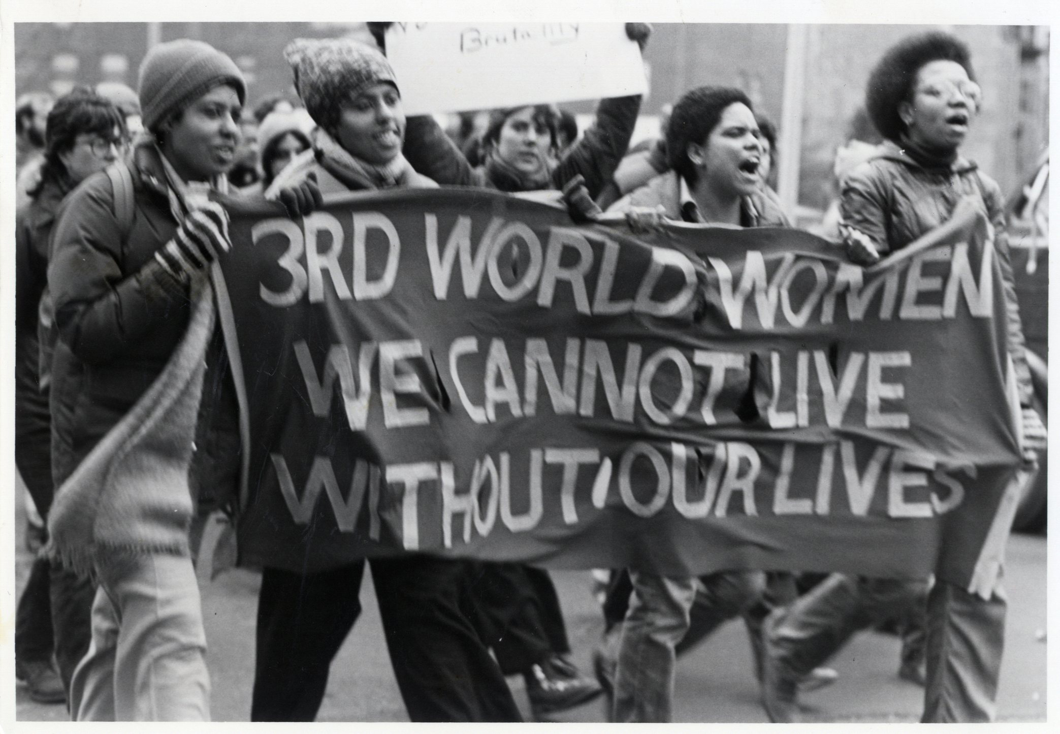Photographie de couverture : De gauche à droite, Beverly Smith, Barbara Smith et deux autres membres non-identifiées du Combahee River Collective, au cours d’une manifestation (le 15 janvier 1980, à Boston, Massachusetts) en solidarité avec Bellana Borde et en opposition aux violences policières dirigées contre les communautés de couleur. Le Combahee River Collective (cf. note 10, ci-dessous) rassemblait des militantes lesbiennes féministes noires, actives notamment de 1974 à 1980 à Boston. La pancarte indique “Femmes du tiers-monde. Nous ne pouvons pas vivre sans nos vies.”