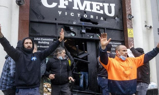 Des responsables du CFMEU tentent de garder le bureau du syndicat lors d’une attaque par des manifestants anti-vax (dont de nombreux membres du CFMEU) le lundi 20 septembre