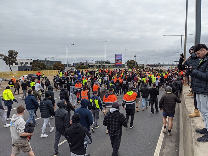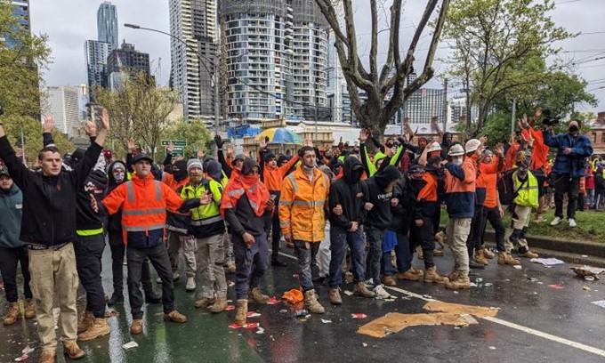 L’entrée du siège du syndicat sans doute le plus puissant de Victoria, le CFMEU, a été saccagée par une foule féroce cet après-midi. Peut-être que 500 travailleurs de la construction, beaucoup de grands sites de la ville et d’autres de la banlieue, s’étaient rassemblés à l’extérieur sur Elizabeth Street, juste au nord du quartier central des affaires de Melbourne, dès la fin de la matinée. Ils provenaient de nombreux sites et entreprises différents: le développement commercial Elizabeth North à proximité, la rue Queen de Paragon, le béton I & D, SG Formwork, le tunnel du métro, Image Building Group et d’autres – grues et gréement, métiers de finition et électricité, etc.