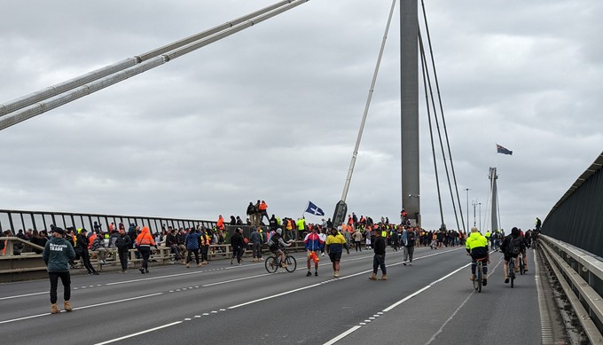 Manifestants au sommet du pont West Gate le mardi 21 septembre PHOTO: Ben Hillier