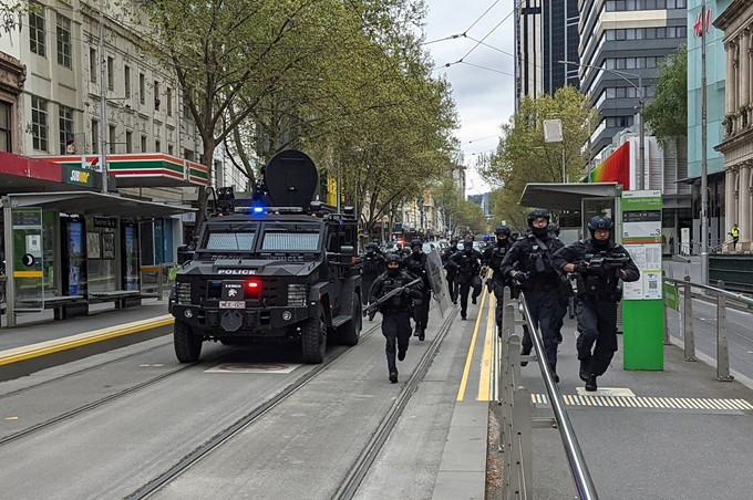 Vers l’heure du déjeuner, une mobilisation massive de flics, menée par un véhicule blindé, a confronté le groupe à la Poste. La police anti-émeute a chargé et tiré plus d’une douzaine de balles en caoutchouc et de balles de poivre. Leurs rangs se sont divisés, les fascistes se sont précipités dans le centre commercial. Un terrain regroupé sur la rue Swanston. Mais il n’y en avait plus que 50 maintenant.