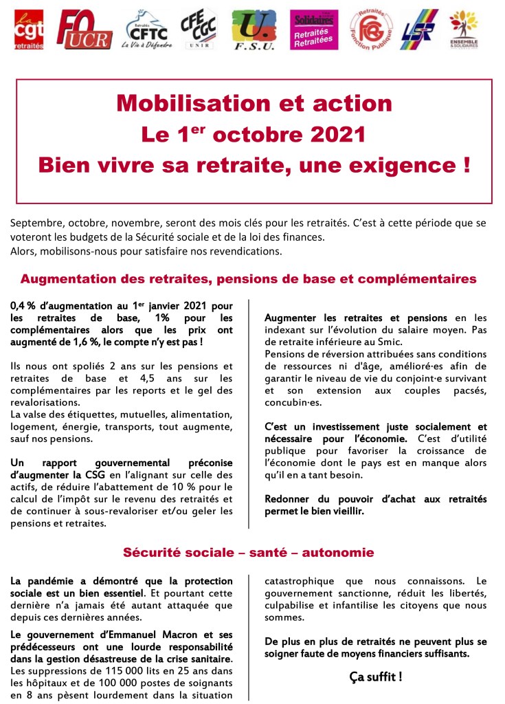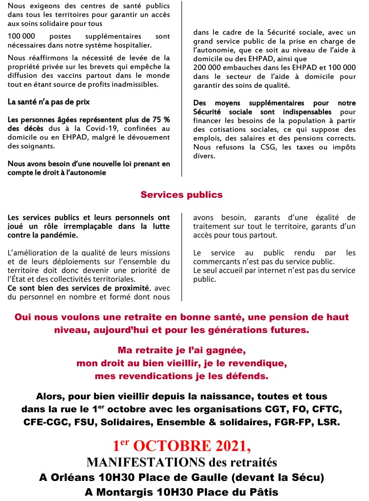 1er OCTOBRE 2021, MANIFESTATIONS des retraités A Orléans 10H30 Place de Gaulle (devant la Sécu)