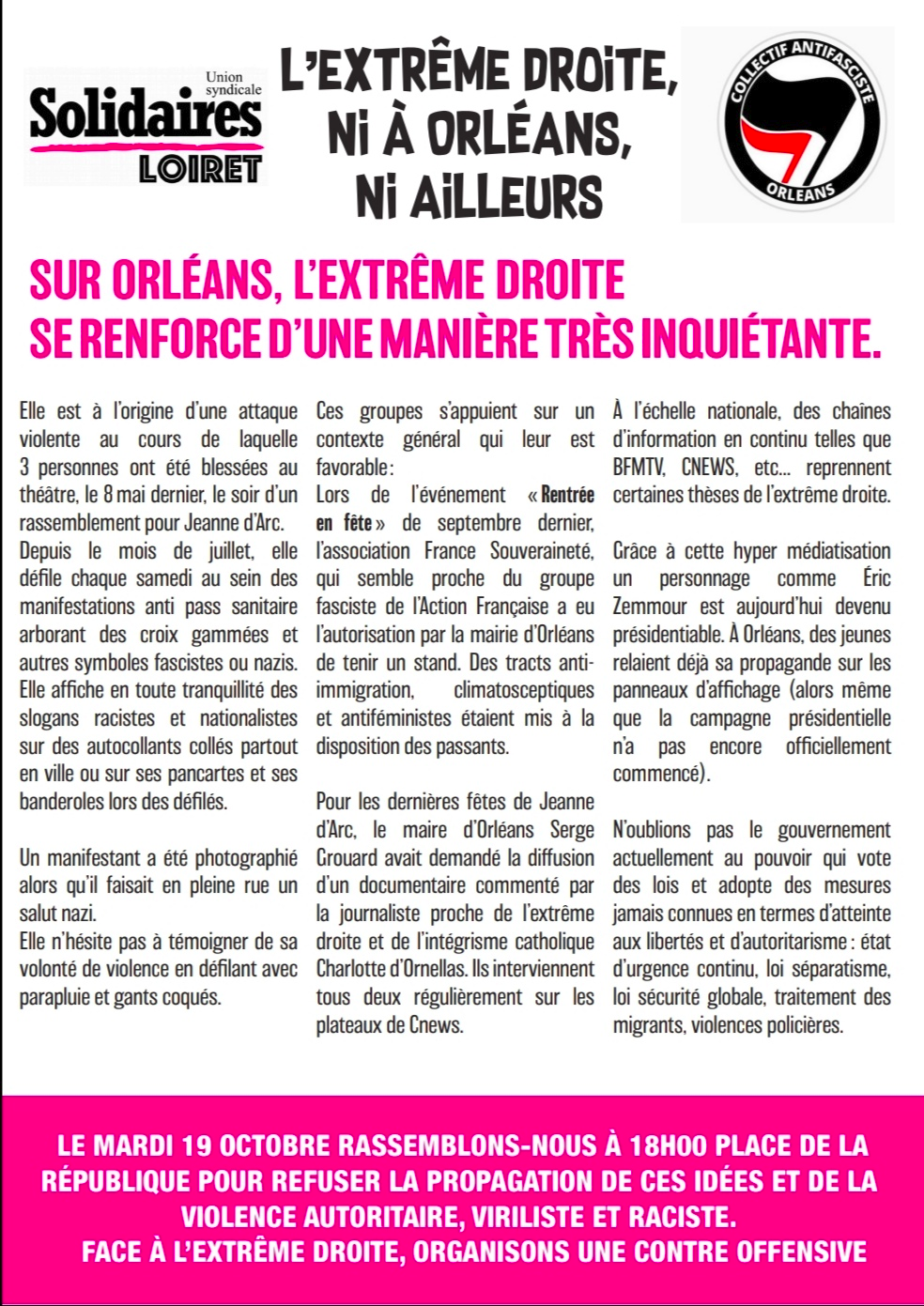 ORLEANS : Appel à rassemblement contre l’Extrême Droite le 19 octobre 18H place de la République