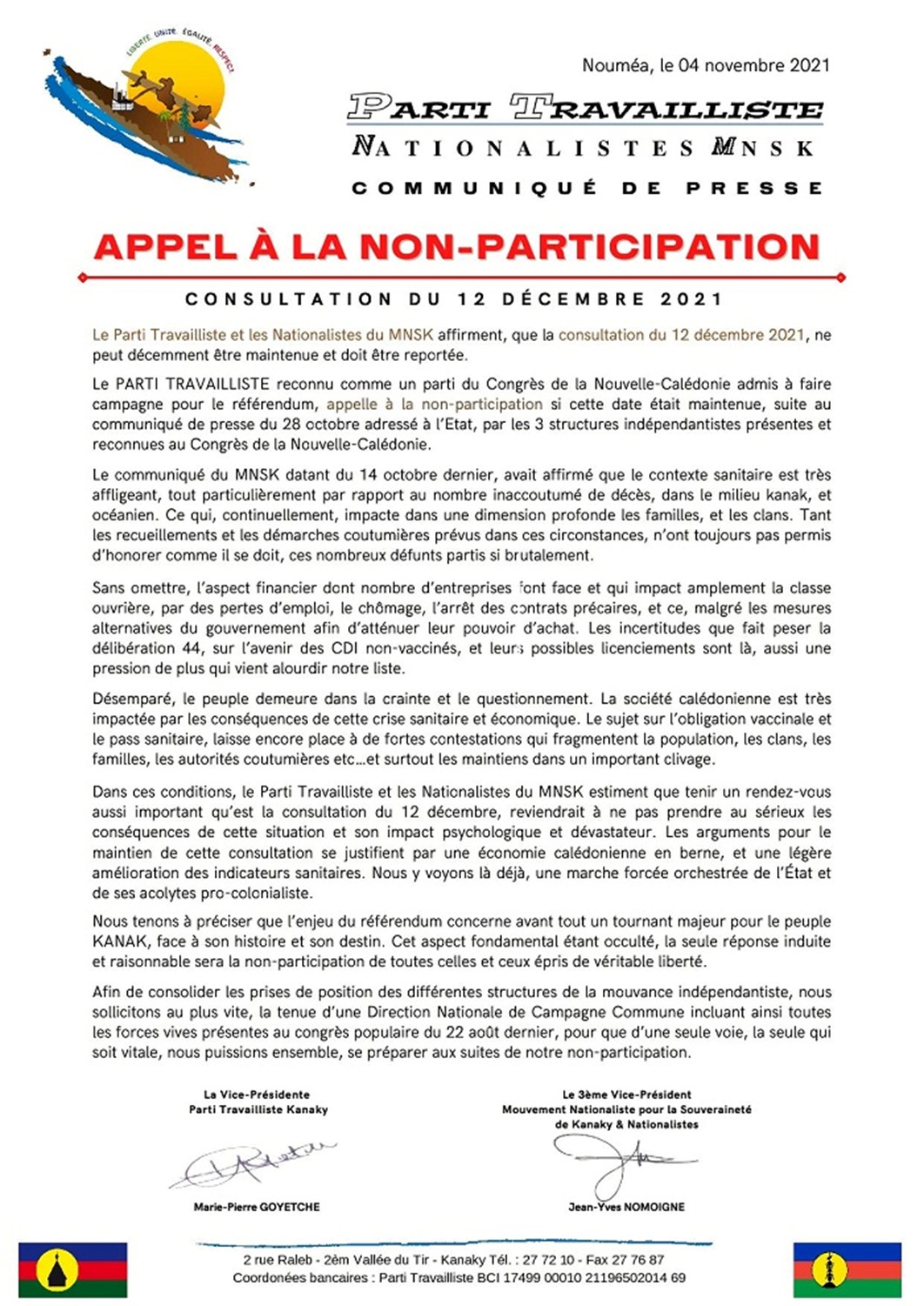 Toutes les organisations membres du Front de libération nationale kanak et socialiste (FLNKS), les autres partis politiques indépendantistes, l’Union syndicale des travailleurs Kanak et des exploités (USTKE), des associations, et des dizaines de communes appellent à ne pas organiser ce referendum en décembre 2021, à le reporter au second semestre 2022 et à ne pas y participer s’il est maintenu à la date choisie par l’État français et les mouvements colonialistes .
