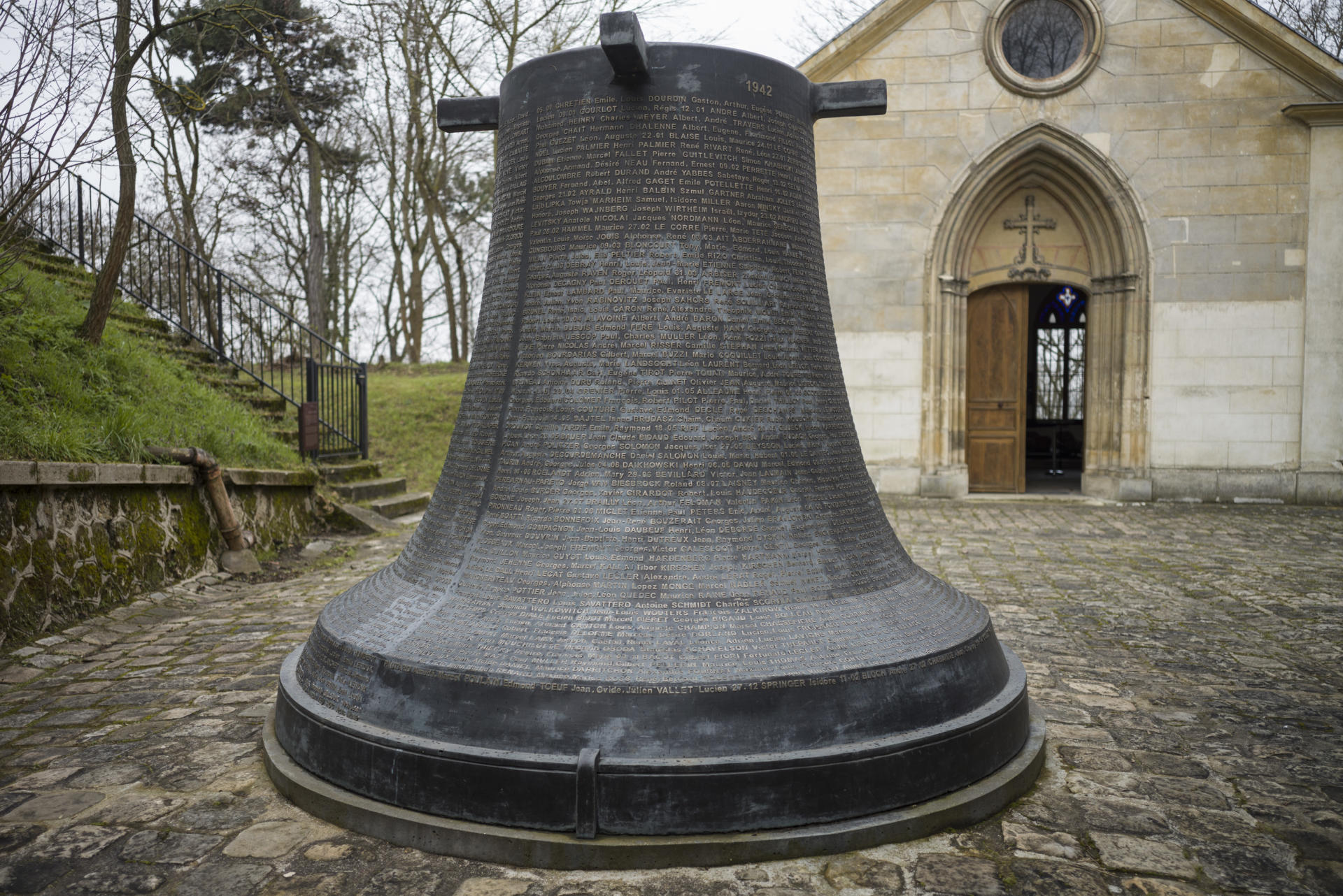 La cloche en bronze de Pascal Convert, sur laquelle sont inscrits les noms des fusillés du Mont-Valérien. Privée de son battant, celle-ci repose, dans un silence éternel, devant la chapelle désaffectée où les prisonniers étaient réunis avant d’aller au supplice dans une clairière située en contrebas. CYRILLE WEINER POUR « LE MONDE »
