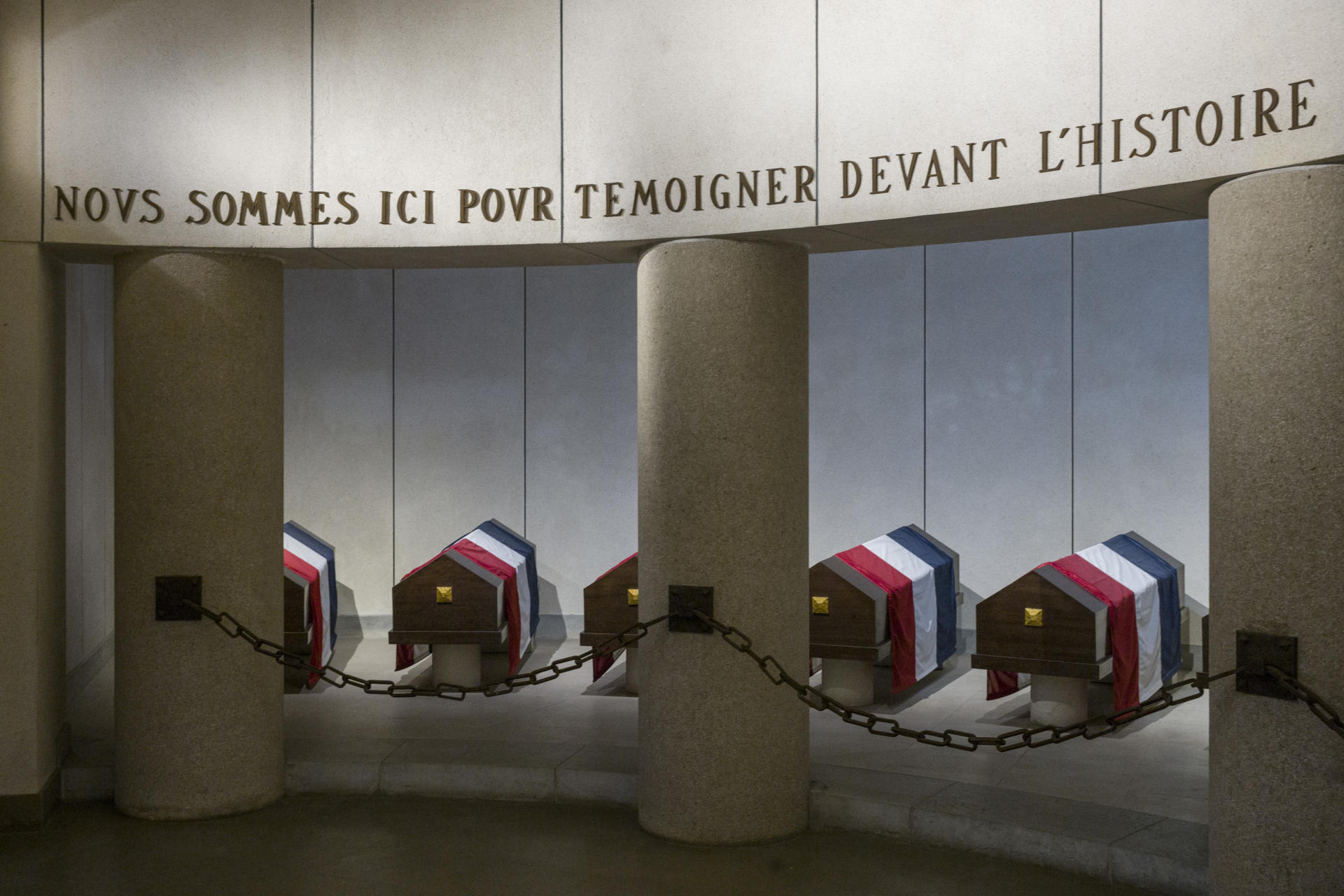 Deux portes de bronze ouvrent sur la crypte où sont enterrés en arc de cercle quatorze héros et deux héroïnes de la guerre : soldats libérateurs, résistants fusillés ou déportés, tous morts pendant les années sombres. La voûte qui résonne à chaque murmure, les drapeaux tricolores sur les catafalques d’ébène et d’acajou (les corps reposent en dessous, dans un caveau), l’urne funéraire contenant des cendres et de la terre provenant de plusieurs camps de concentration : la scénographie raconte un pays dressé contre le nazisme. « Nous sommes ici pour témoigner devant l’histoire que de 1939 à 1945 ses fils ont lutté pour que la France vive libre », proclame sans nuance une phrase gravée dans la pierre.