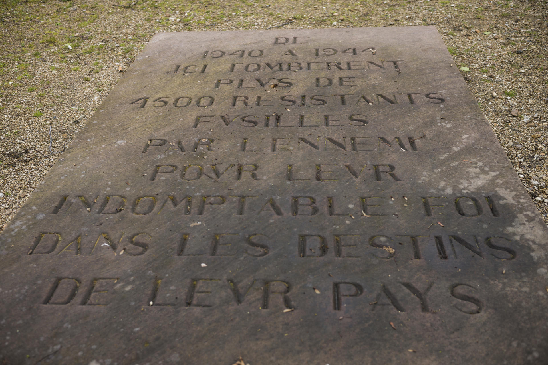 La plaque déposée après la guerre dans la clairière des fusillés, avec un chiffre qui ne correspond pas à la réalité historique. CYRILLE WEINER POUR « LE MONDE »