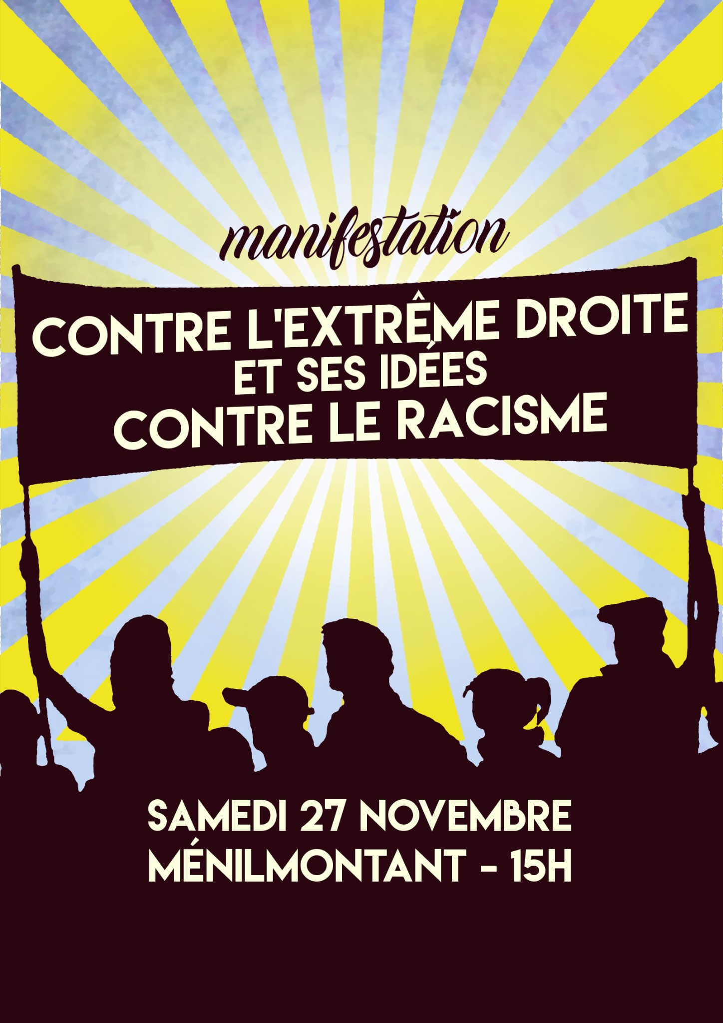 À l’appel de plusieurs organisations une manifestation contre l’extrême-droite, ses idées et le racisme se tiendra à Paris le 27 novembre à 15h à Ménilmontant.