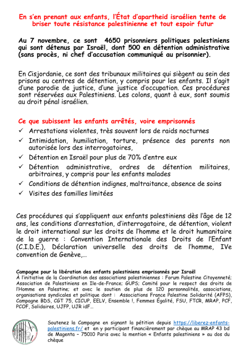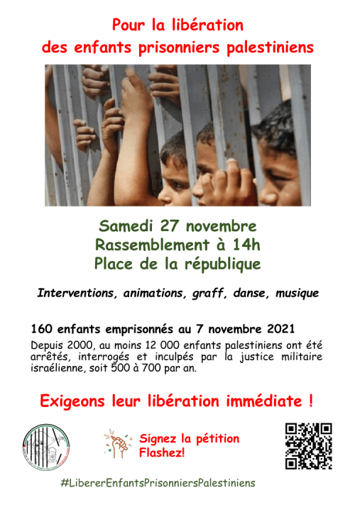 Pour informer l’opinion publique en France et dénoncer cette grave situation, nous organisons, avec les associations, organisations syndicales et politiques de la campagne « Libération immédiate des enfants palestiniens prisonniers d’Israël » un rassemblement samedi 27 novembre.