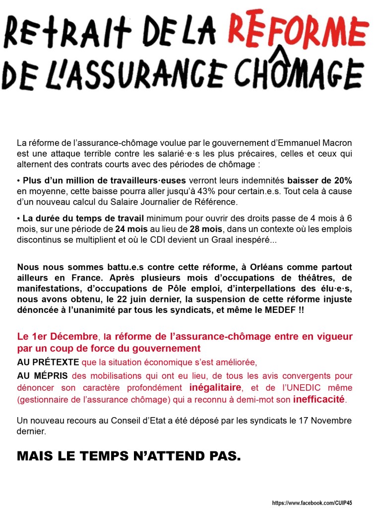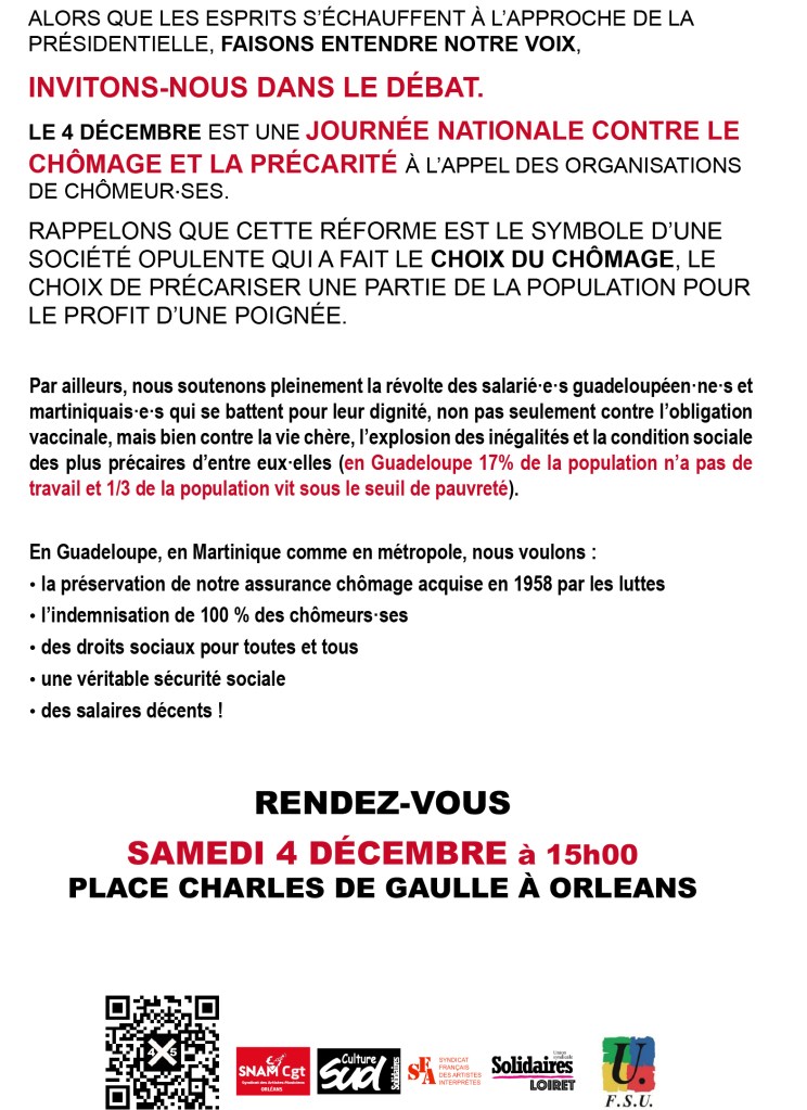 Suite à la mise en place au 1er décembre 2021 de la réforme de l’assurance chômage par le gouvernement, les syndicats appellent à une journée d’action ce 4 décembre. Dans le cadre de cette journée nationale contre la précarité et le chômage, le Cuip 45, Collectif Unitaire Intermittents Précaire du Loiret, le syndicat des artistes musiciens d’Orléans, le collectif Solidaires Sud