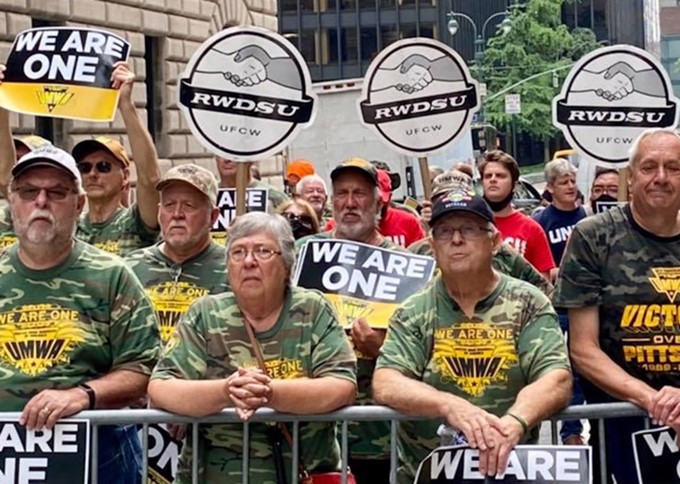 NEW YORK CITY CENTRAL LABOR COUNCILStriking Warrior Met coal miners from Brookwood, Alabama, members of United Mine Workers union, and their supporters protested at NY offices of hedge fund BlackRock July 28.