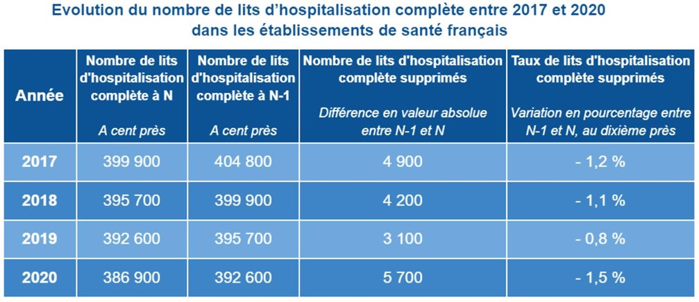 Selon ces ouvrages, le nombre de lits d’hospitalisation complète, ou hospitalisation à temps complet (lorsque le patient passe au minimum une nuit à l’hôpital), s’élevait en 2017 à 399 866 lits, en 2018 à 395 701, et en 2019 à 392 593. Les chiffres 2020 n’ayant pas encore été révisés, on ne dispose à ce jour que d’une estimation, à hauteur de 386 835 lits.