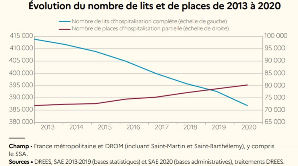Une tendance qui se poursuit depuis des années. Selon le rapport, entre 2013 et 2020, ce sont près de 27 000 lits qui ont disparu des hôpitaux. La moyenne était de -0,9 % jusqu’à 2019 et de -1,5 pour l’année écoulée. À l’inverse, les places d’hospitalisation partielle, pour les séjours de moins de 24 heures, continuent d’augmenter, passant de 72 000 en 2013 à 80 000 en 2020.