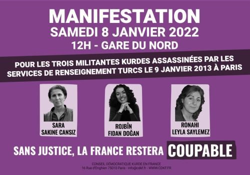 Marche blanche mercredi 5 janvier 2022, à 11h00, du Centre démocratique du Kurdistan (16 rue d’Enghien) jusque devant les locaux du centre d’information du Kurdistan (CIK, 147 rue La Fayette) où le massacre a eu lieu. Vous pourrez à cette occasion déposer des fleurs pour rendre hommage aux trois femmes.