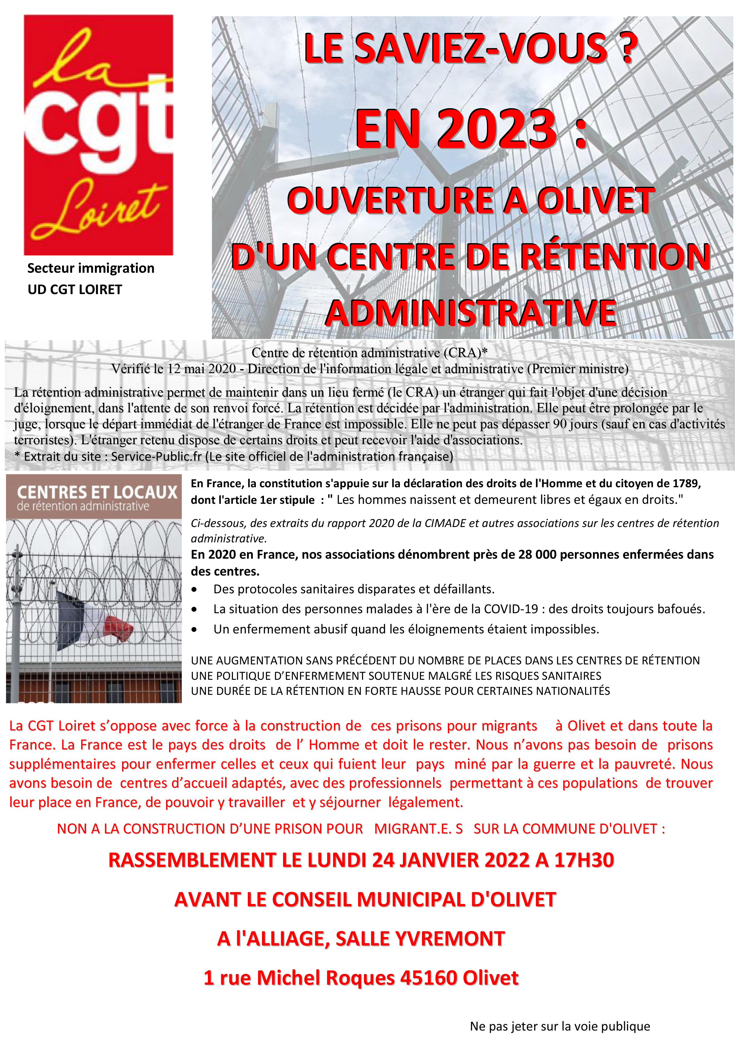 La CGT Loiret appelle à un rassemblement à Olivet le 24 janvier 2022 contre la construction du centre de rétention administrative (PJ). Le collectif COLERE s’associe à cette action et appelle à rejoindre ce rassemblement, lundi à 17h30 à l’Alliage, salle Yvremont, 1 rue Michel Roques à OLIVET.
