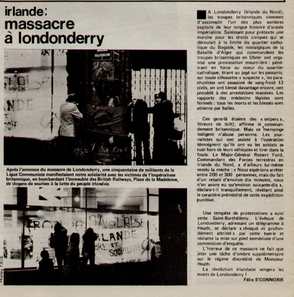 Le Bloody Sunday est «un jour tragique dans notre histoire», a déclaré mercredi, le Premier ministre Boris Johnson, l’un «des plus sombres» des Troubles. L’armée britannique avait affirmé que les parachutistes avaient répondu aux tirs des «terroristes» de l’IRA (Armée républicaine irlandaise). Malgré tous les témoignages contredisant cette version, il faudra attendre 2010 pour que soit officiellement reconnue l’innocence des victimes, atteintes pour certaines dans le dos ou même à terre, agitant un mouchoir blanc.