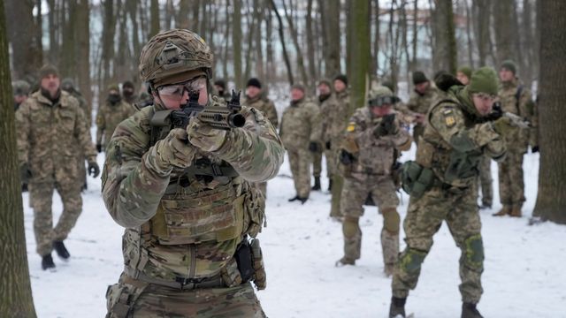 Des membres des Forces de défense territoriale de l’Ukraine, des unités militaires volontaires des Forces armées, s’entraînent dans un parc de la ville de Kiev, en Ukraine, le 22 janvier 2022. (AP Photo/Efrem Lukatsky, File)
