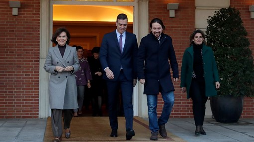 Le premier ministre espagnol Pedro Sanchez (PSOE), deuxième à gauche, marche à côté du chef de Podemos, Pablo Iglesias, deuxième à droite, et de la première vice-première ministre Carmen Calvo, à gauche, au Palais Moncloa à Madrid, en Espagne, le mardi 14 janvier 2020.(Photo: AP Photo/Manu Fernandez)