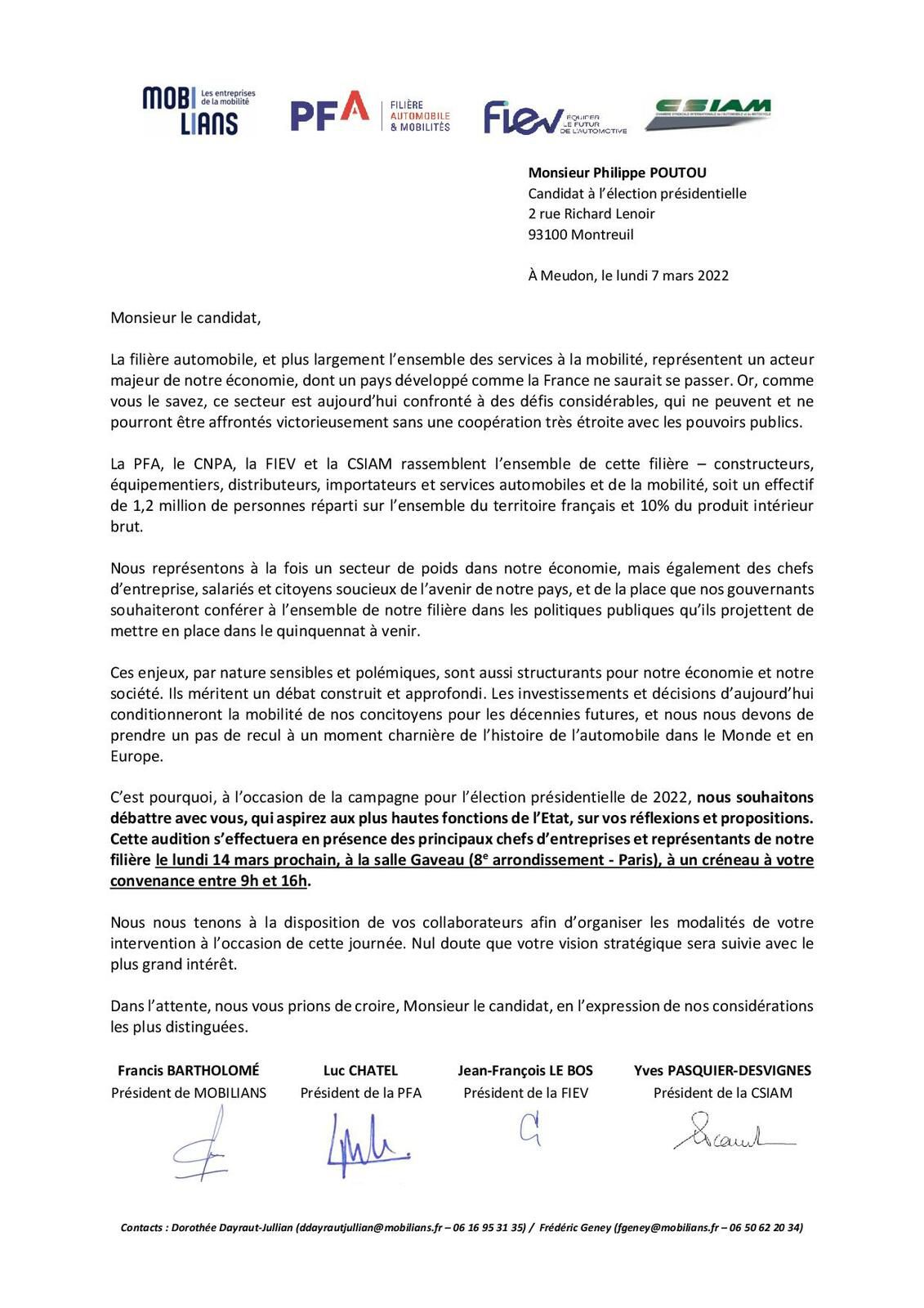 Philippe Poutou a été interrogé, comme les autres candidat(e)s à l’élection présidentielle, sur ses « réflexions et propositions » concernant l’industrie automobile. L’invitation a été faite par les représentants patronaux de la filière automobile prétendant parler au nom des 1,2 millions de salariés de toute la filière. La réponse de Philippe Poutou, préparée avec les militants NPA du secteur, est celle d’un ouvrier licencié de l’usine Ford de Blanquefort en Gironde, défendant les intérêts du monde du travail