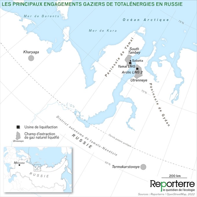Ces deux projets climaticides sont d’une importance capitale pour le pétrolier français. Chaque année, 16,5 millions de tonnes de gaz naturel liquéfié (GNL) sont extraits à Yamal. TotalÉnergies n’a pas hésité à mettre la main au porte-monnaie pour permettre à ce projet démentiel d’advenir. 23 milliards d’euros (un record dans l’histoire du GNL) ont été nécessaires pour mettre sur pied ce complexe industriel. Un aéroport et un port ont également dû être construits, dans une zone battue par les vents, plongée dans l’obscurité pendant deux mois de l’année, et où la température peut atteindre – 50 °C en hiver.
