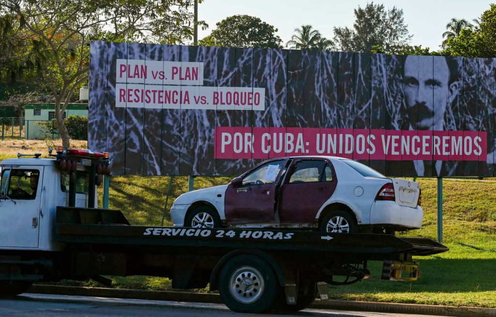 « Tant que (l’embargo) était bilatéral, c’était plus facile pour Cuba », c’était d’ailleurs un sujet « à peine mentionné dans les trois premières décennies de la révolution » par le gouvernement cubain, alors soutenu par le grand frère soviétique.Un panneau disant « Plan contre plan, Résistance contre bloc, Pour Cuba nous vaincrons unis » à La Havane, le 1er février 2022 YAMIL LAGE AFP