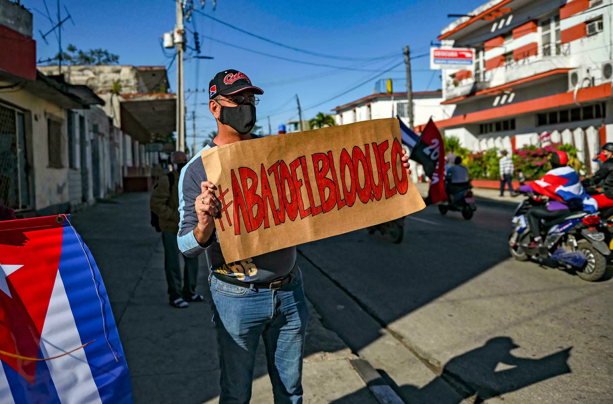 « La politique envers Cuba a été dictée par la politique interne (américaine) depuis la fin de la Guerre froide », précise Ric Herrero. Traditionnellement, le poids électoral de la Floride – Etat susceptible de faire basculer les élections et avec une forte diaspora cubaine – a empêché toute détente.Un homme porte une pancarte disant « A bas le blocus » à Santa Clara, Cuba, le 30 janvier 2022 YAMIL LAGE AFP