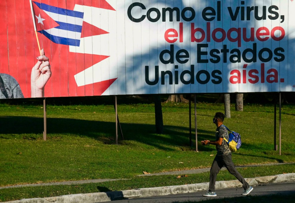 A Cuba, on l’appelle le « bloqueo interno » : « la bureaucratie, la centralisation excessive, le manque d’incitations pour les producteurs », résume l’économiste Omar Everleny Pérez. « Economiquement, le blocus (américain) est l’une des causes de la situation à Cuba, mais pas la seule ».Un homme passe devant un panneau disant « Comme le virus, le blocus des Etats-Unis isole », à La Havane le 31 janvier 2022 YAMIL LAGE AFP