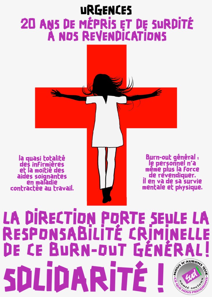 La quasi-totalité du personnel non médical a fini par craquer : 140 arrêts de travail ! La médecine du travail a reconnu leur burn-out général et les collègues ont toutes et tous été arrêtés en maladie contractée au travail ! C’en est trop pour la direction qui mandatera, peut-être, des experts pour vérifier la « véracité » de ces arrêts : coût prévu 24.000 € encore jetés par les fenêtres ! Les médecins ont déposé un préavis de grève et menacent, eux aussi de se mettre en maladie professionnelle si la direction continue de les mépriser en restant sourde à leurs revendications.