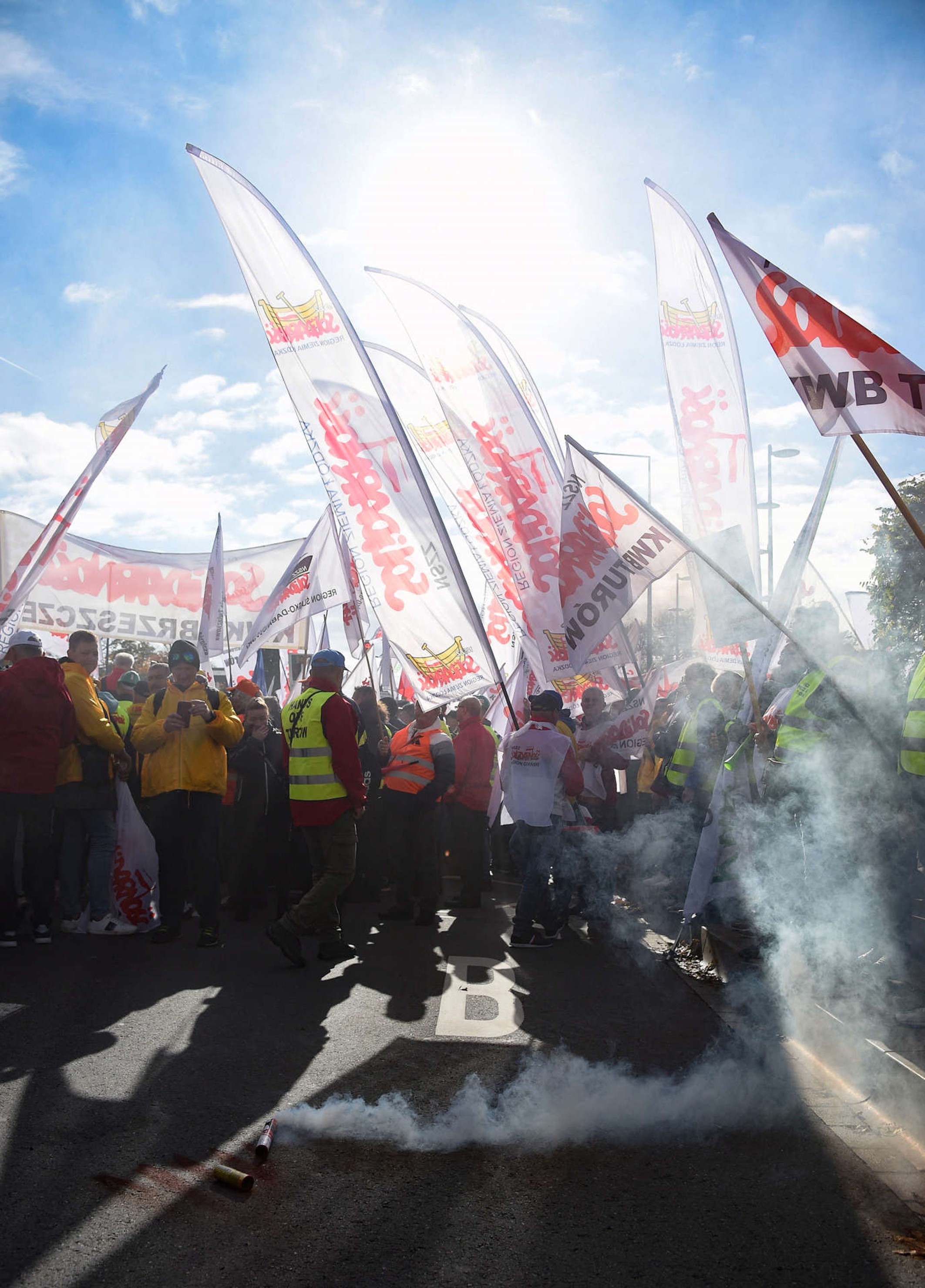Des militants du syndicat polonais Solidarnosc, lors d’une manifestation au Luxembourg, le 22 octobre 2021. JEAN-CHRISTOPHE VERHAEGEN / AFP