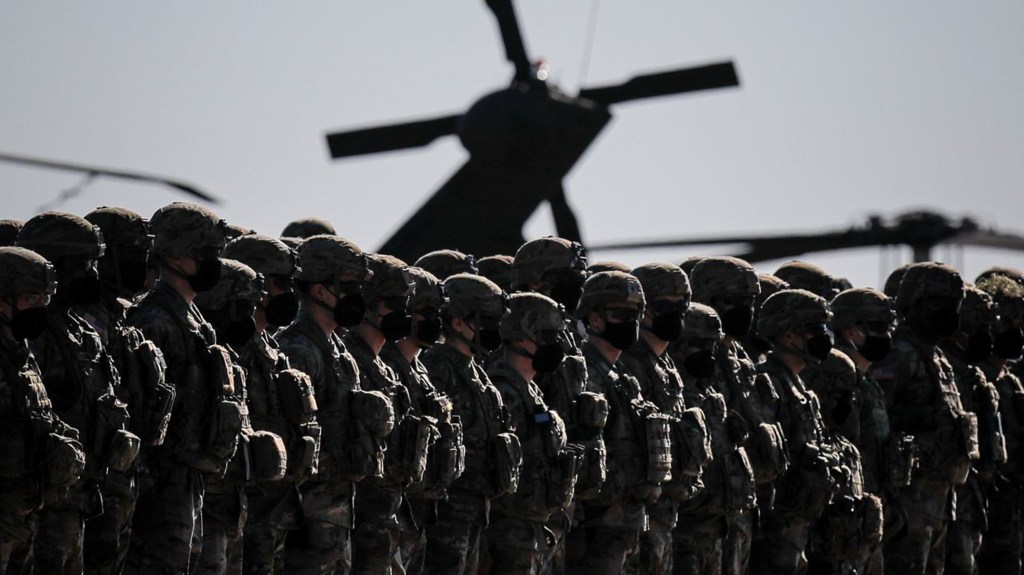 Des soldats américains alignés pendant la visite du secrétaire général de l’OTAN, Jens Stoltenberg, à la base aérienne Mihail Kogalniceanu, près de Constanta, ville portuaire de la mer Noire, dans l’est de la Roumanie, le vendredi 11 février 2022 [Crédit : AP Photo/Andreea Alexandru].