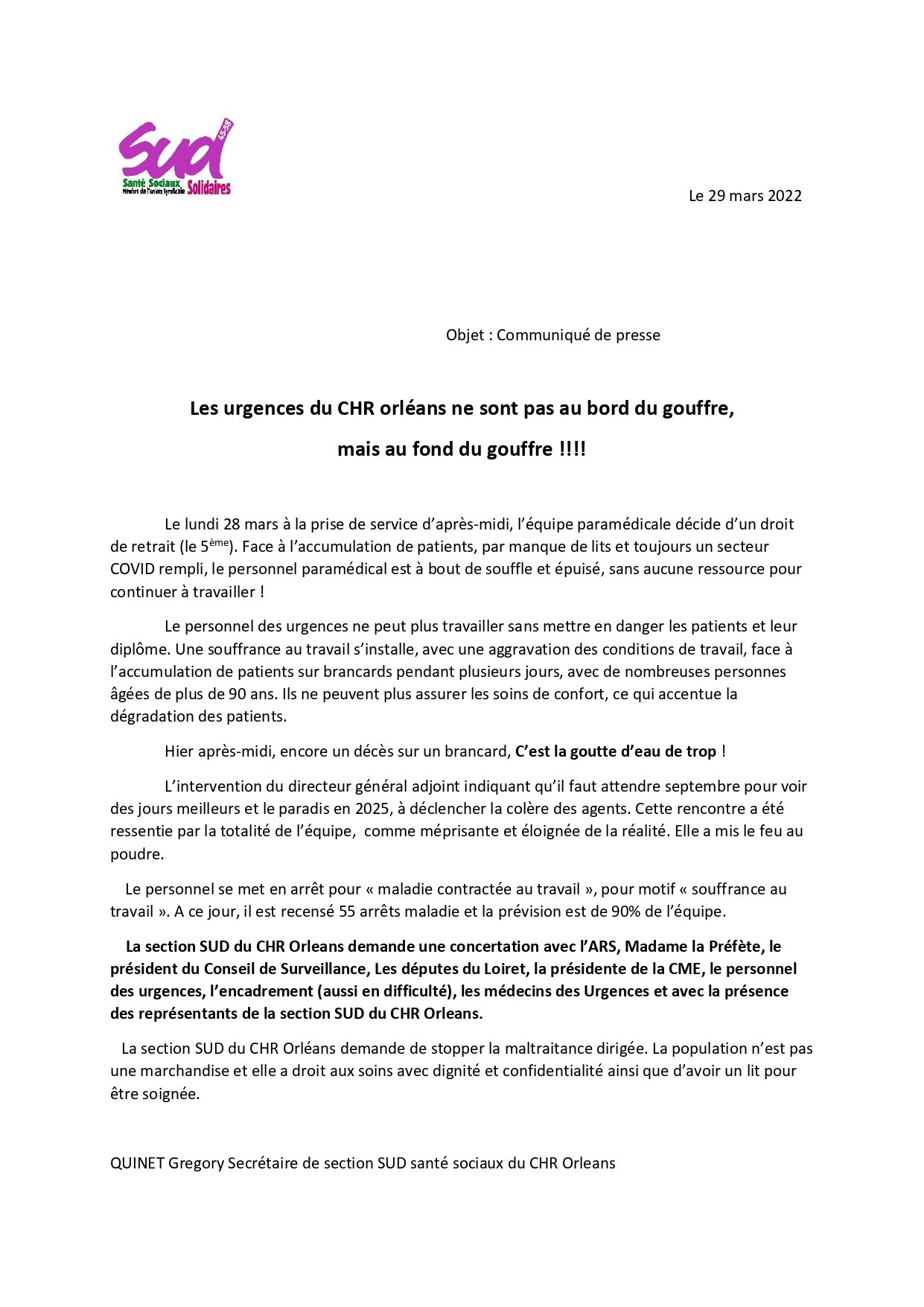 A Orléans, la situation pourrait s’aggraver. Un préavis de grève a été déposé. Les médecins du service, une trentaine, envisagent une grève « dure » à compter du 8 avril si aucune solution n’est trouvée : « On ne viendra pas juste travailler avec un brassard », prévient l’un d’eux, soulignant qu’il s’agit d’un mouvement « du dernier espoir », « un baroud d’honneur », avant de voir sinon pleuvoir les démissions. Le service est pourtant dans une « dynamique très positive », à entendre plusieurs médecins, avec, malgré des postes vacants, une situation relativement bonne sur le plan des ressources humaines. « On a déjà tout donné, on a sacrifié notre santé, notre vie de famille, ce n’est plus possible, on ne peut plus couler avec le bateau… », alerte le docteur Matthieu Lacroix, qui espère un écho national : « Il faut un plan d’urgence pour sauver l’hôpital public, il s’écroule, c’est vraiment effrayant. »