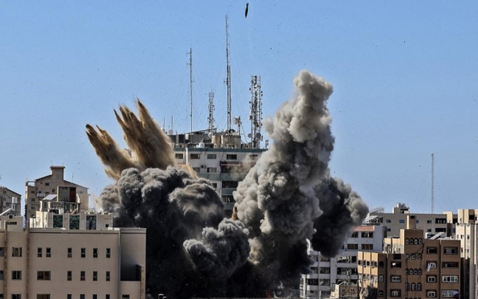 De la fumée s’élève alors qu’une bombe est larguée sur la tour Jala lors d’une frappe aérienne israélienne sur Gaza, le 15 mai 2021 (Mahmud Hams)