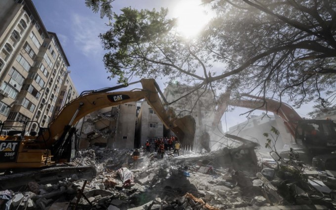 Une pelleteuse dégage les décombres d’un bâtiment détruit dans le quartier résidentiel al-Rimal de Gaza après une frappe aérienne israélienne, le 16 mai 2021 (AFP)