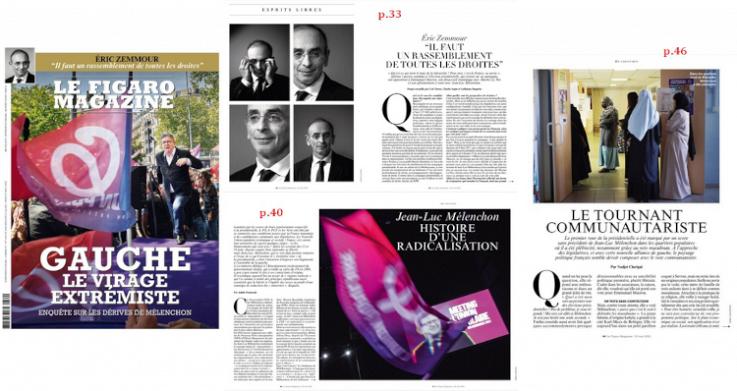 Une campagne idéologique de tous les instants dans le Figaro Magazine, qui dans un retournement invraisemblable, publiait le 20 mai un dossier intitulé « Gauche. Le virage extrémiste. Enquête sur les dérives de Mélenchon » – dont le contenu n’a rien à envier aux productions de Valeurs actuelles – précédé quelques pages plus haut d’une interview en majesté… d’Éric Zemmour !