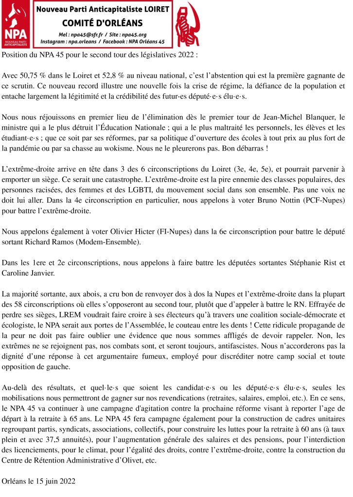 L’extrême-droite arrive en tête dans 3 des 6 circonscriptions du Loiret (3e, 4e, 5e), et pourrait parvenir à emporter un siège. Ce serait une catastrophe. L’extrême-droite est la pire ennemie des classes populaires, des personnes racisées, des femmes et des LGBTI, du mouvement social dans son ensemble. Pas une voix ne doit lui aller. Dans la 4e circonscription en particulier, nous appelons à voter Bruno Nottin (PCF-Nupes) pour battre l’extrême-droite.