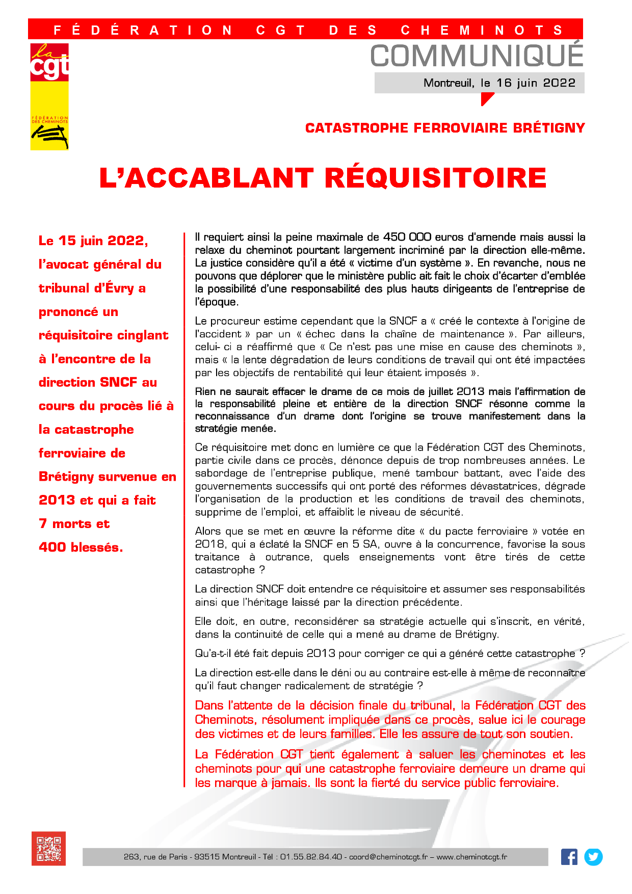 Au procès de la catastrophe ferroviaire de Brétigny, la SNCF a demandé sa relaxe ce 17 juin, son avocat soutenant que l’accusation n’avait ni réussi à démontrer «un scénario précis» de l’accident ni des failles dans la maintenance des voies. Après huit semaines d’audience devant le tribunal correctionnel d’Évry, le procureur avait requis deux jours plus tôt la peine maximale de 450.000 euros d’amende contre la SNCF pour homicides et blessures involontaires dans l’accident de Brétigny en 2013, qui a tué sept personnes et blessé des centaines d’autres.