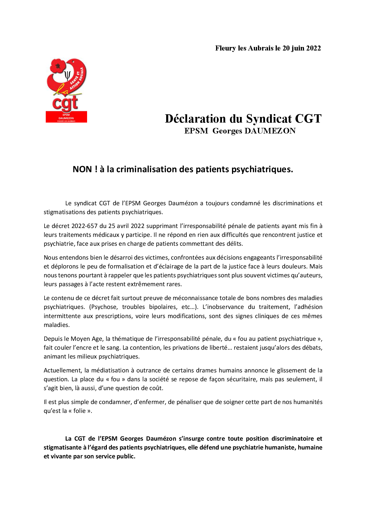 – une AG des personnels mardi 21/06 à 14h30 devant les locaux syndicaux pour organiser l’action du lundi, la répartition pour une distribution d’un tract à la population alertant sur la situation et appelant au soutien…