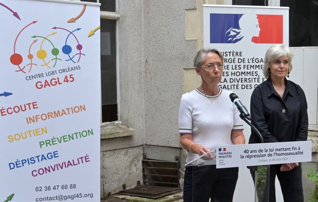 Elisabeth Borne (à gauche) prononce un discours à côté de la ministre française de l’égalité des genres, de la diversité et de l’égalité des chances Isabelle Rome (à droite) lors d’une visite du centre LGBT+ GAGL45 (Groupe d’action gay, lesbien du Loiret) à Orléans, le 4 août 2022.GUILLAUME SOUVANT/AFP