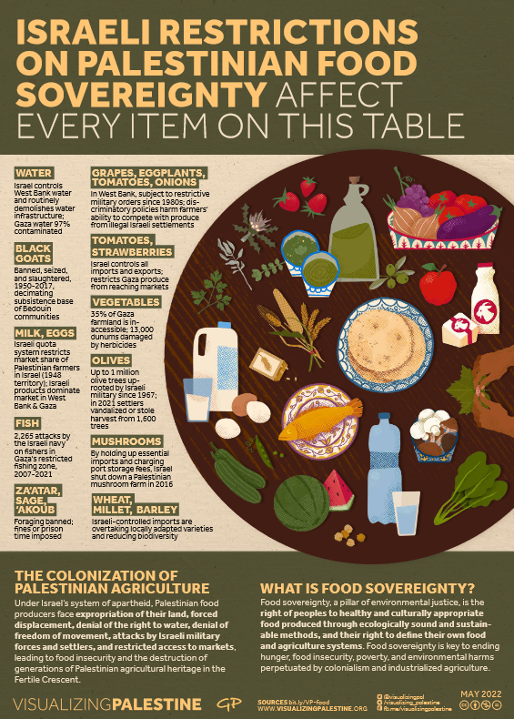 L’occupation israélienne des territoires palestiniens a conduit à de graves violations des droits de l’homme et de l’environnement. Certains d’entre eux sont la pollution, la destruction des moyens de subsistance, les lois discriminatoires, les expulsions forcées et les déplacements. Un autre crime important a été l’accaparement des terres et de l’eau qui affecte la production alimentaire et la souveraineté alimentaire des personnes vivant dans ces territoires.