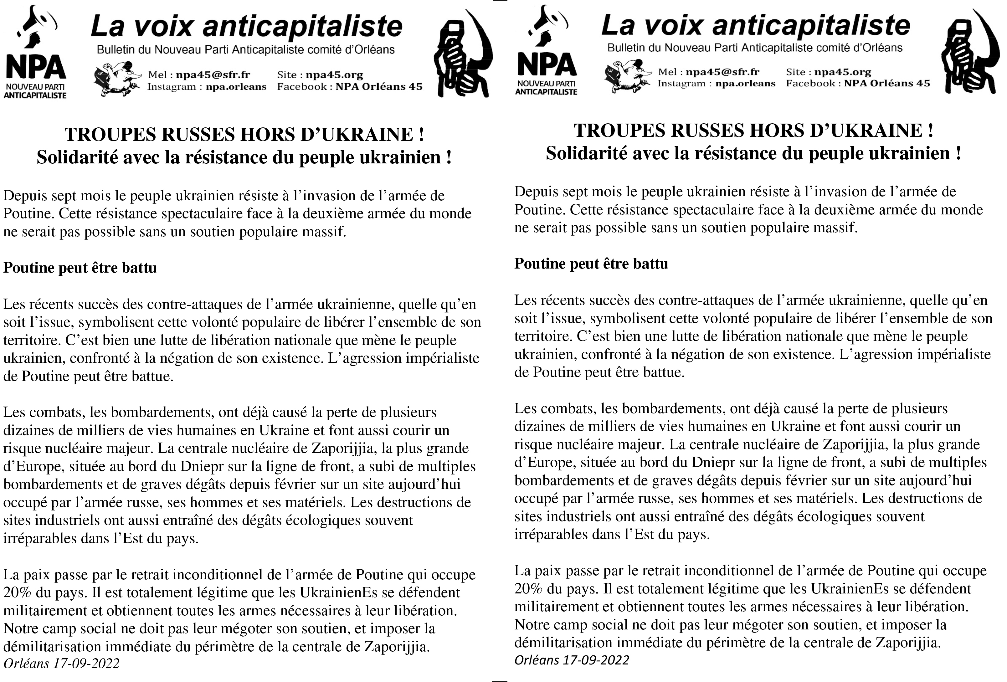 La paix passe par le retrait inconditionnel de l’armée de Poutine qui occupe 20% du pays. Il est totalement légitime que les UkrainienEs se défendent militairement et obtiennent toutes les armes nécessaires à leur libération. Notre camp social ne doit pas leur mégoter son soutien, et imposer la démilitarisation immédiate du périmètre de la centrale de Zaporijjia.
