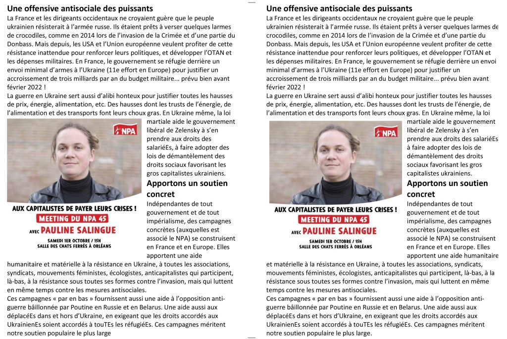 Indépendantes de tout gouvernement et de tout impérialisme, des campagnes concrètes (auxquelles est associé le NPA) se construisent en France et en Europe. Elles apportent une aide humanitaire et matérielle à la résistance en Ukraine, à toutes les associations, syndicats, mouvements féministes, écologistes, anticapitalistes qui participent, là-bas, à la résistance sous toutes ses formes contre l’invasion, mais qui luttent en même temps contre les mesures antisociales.