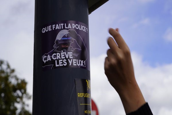 Des autocollants ont été apposés sur le chemin du cortège lors de la manifestation anti-fasciste, à Besançon. • © Sarah Rebouh – France Télévisions